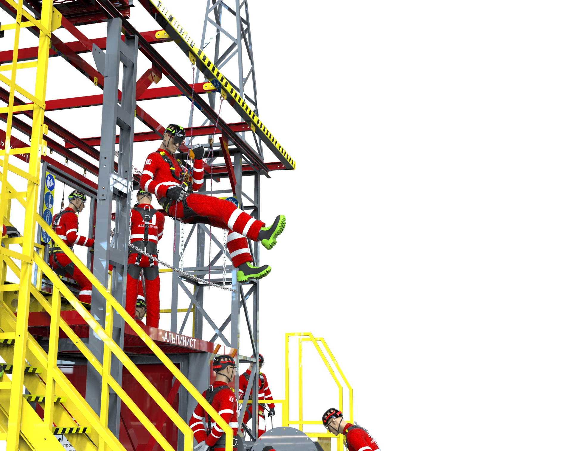 Тренажёр установили на заранее подготовленную площадку размером 11х5 м. Для безопасности обучающихся на площадке тренажёра уложено резиновое покрытие. Сам тренажёр имитирует максимально реальные условия работы. Он оснащён вертикальными и горизонтальными анкерными линиями, блокирующими устройствами, окнами, люками, лестницами. Имеются и средства индивидуальной защиты: страховочные привязи, стропы, карабины, защитные каски.